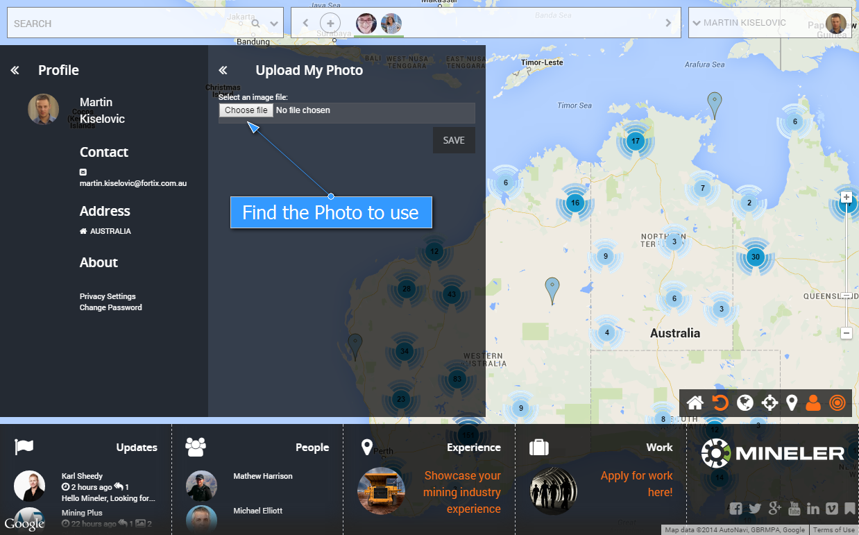 Update Profile Photo Created: December 15, 2014 / Author: Mineler Support Get recognised by uploading your photo! Click on your name at the top right of screen. Select Profile. Click on the circle. Click choose file and locate the file to be uploaded and click save. Congratulations! Your new photo is public now. Tagged:Web App